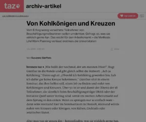 In dem Artikel „Von Kohlkönigen und Kreuzen“ berichtet Susanne Gieffers über den ersten Life/Work-Planning Kurs in Deutschland außerhalb von Universitäten. Dieser wurde gemeinsam von Julia Glöer und Marc Buddensieg geleitet.